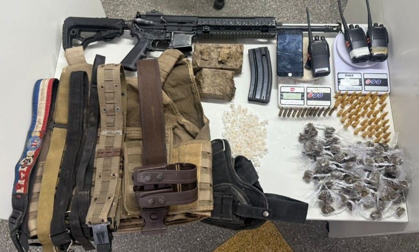 Após o confronto, os militares realizaram buscas nas imediações e localizaram um fuzil calibre 5,56 com um carregador e 12 munições, 100 pedras de crack, 82 porções de maconha e dois tabletes da mesma substância, 52 pinos de cocaína, uma capa de colete balístico, três rádios comunicadores, um aparelho celular, quatro bandoleiras, duas balanças de precisão e um coldre.