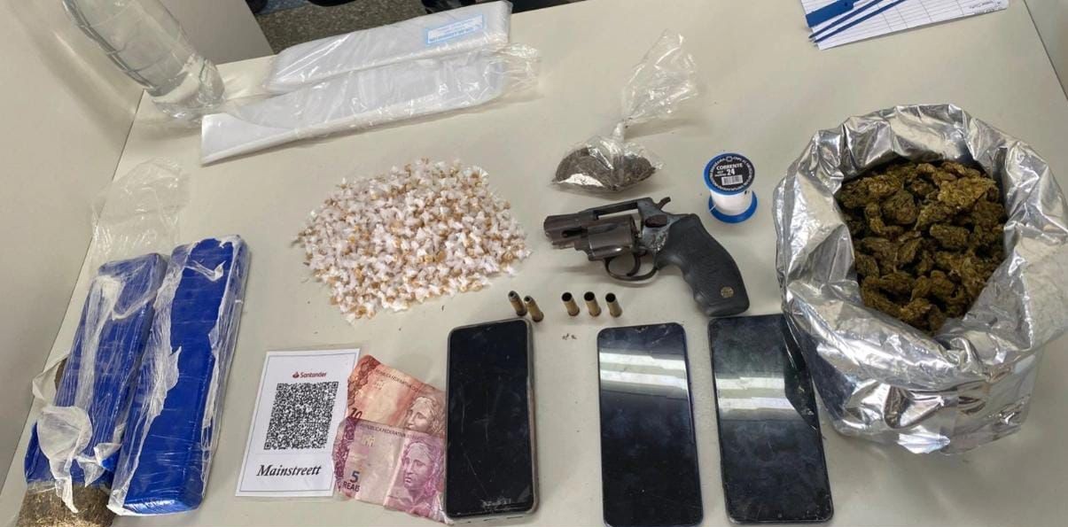 Eles estavam em posse de saco preto que continha 479 porções de crack, três porções de maconha, três aparelhos celulares, um revólver calibre 38 e duas munições.