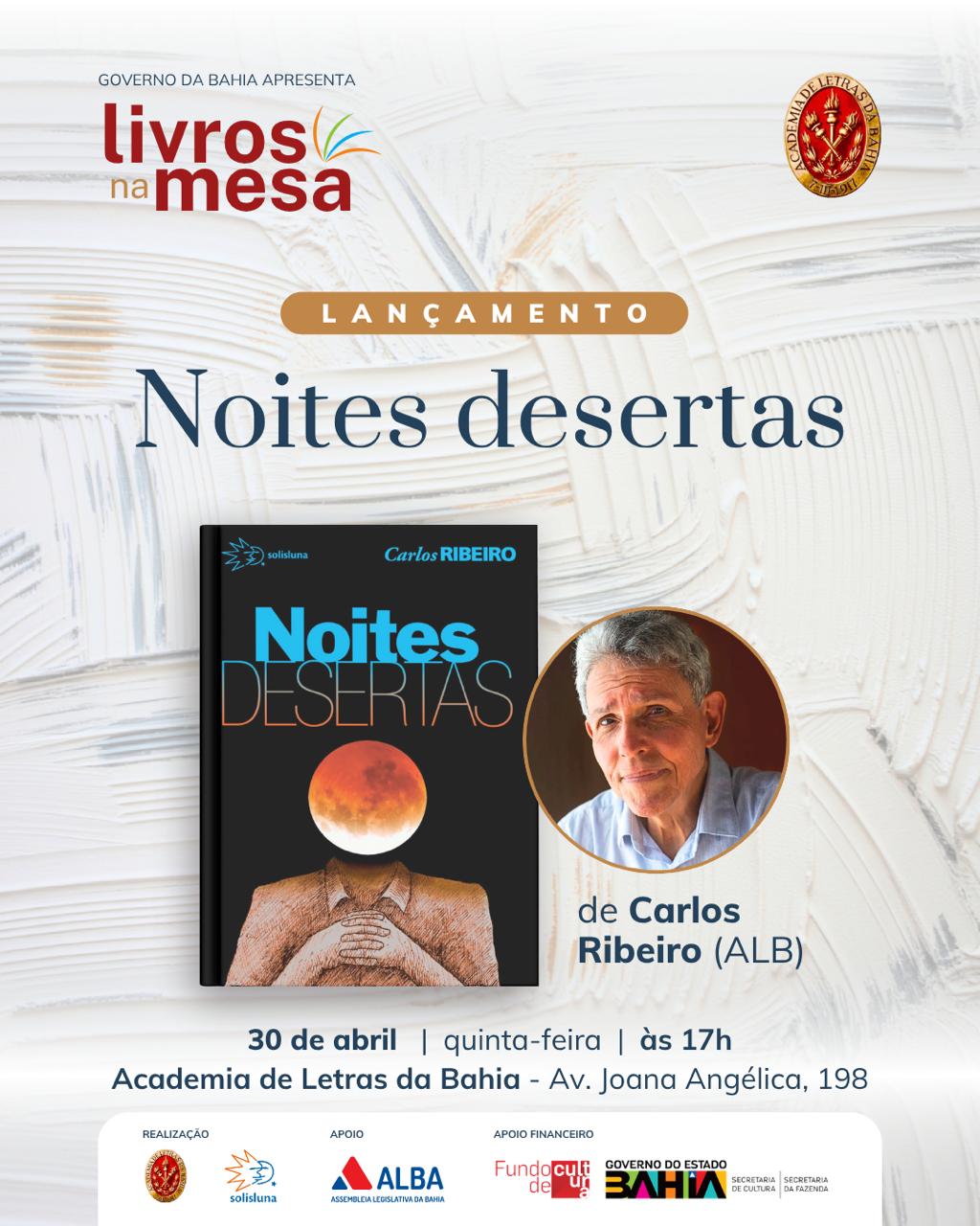 Por Liliana Peixinho – O jornalista, professor, escritor, pesquisador, Carlos Ribeiro, lança seu mais novo livro, ‘Noites Desertas’. O evento será na próxima quinta-feira (30), às 17 horas, na Academia de Letras da Bahia, na Avenida Joana Angélica, em Salvador.